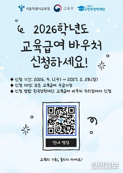 한민일보 서울포커스 국용호 기자 | 서울특별시교육청은 저소득층 가정 학생들이 경제적 부담 없이 학업에 전념할 수 있도록 돕는 ‘2026학년도 교육급여 바우처’를 오는 4월 1일부터 내년 2월 28일까지 교육급여 바우처 전용 누리집에서 신청할 수 있다고 밝혔다.