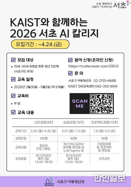 한민일보 서울포커스 곽중희 기자 | 서울 서초구가 카이스트와 함께 4월 24일까지 AI 전문가를 양성하는 ‘서초 AI 칼리지’ 교육 참여자 모집에 나선다고 밝혔다.