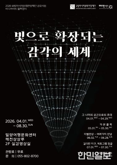 한민일보 서울포커스 김은금 기자 | 밀양문화관광재단은 국립아시아문화전당재단이 주관한 ‘미디어아트 협력 전시’ 공모사업에 선정돼 오는 4월 1일부터 8월 30일까지 밀양여행문화센터 해천상상루에서 미디어아트 전시 ‘빛으로 확장되는 감각의 세계’를 개최한다.