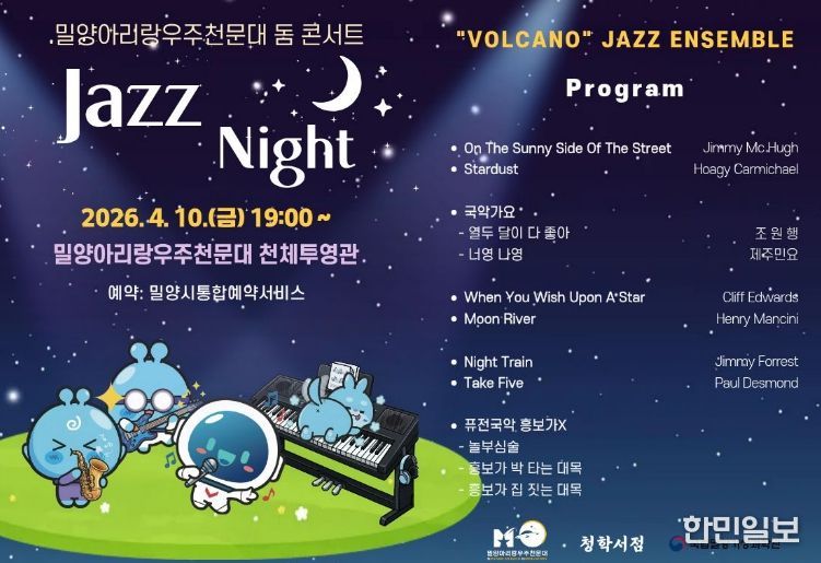 한민일보 서울포커스 김은금 기자 | 밀양문화관광재단은 오는 4월 10일 밀양아리랑우주천문대 천체투영관에서 우주와 음악이 결합한 특별한 문화 행사 ‘재즈 나이트(Jazz Night)’를 개최한다.