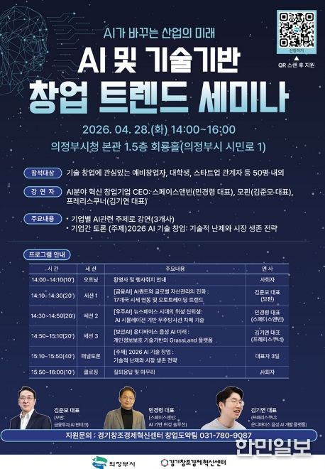이어 ‘AI 및 기술기반 창업 트렌드 세미나’는 28일 시청 회룡홀에서 개최되며, AI 분야 혁신기업 3개 사가 참여해 산업 변화 사례와 실전 경험을 공유하고 기업 간 토론을 진행할 예정이다.