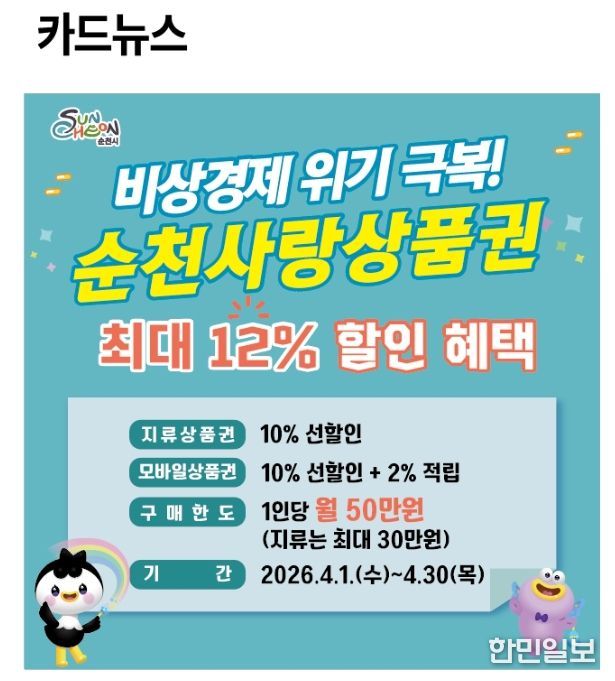 한민일보 서울포커스 임광현 기자 | 순천시가 최근 중동 사태 등 대외 불확실성에 따른 생활물가 상승으로 어려움을 겪는 시민과 소상공인의 생활경제 안정을 위해 4월 한 달간 순천사랑상품권 할인행사를 추진한다고 밝혔다.