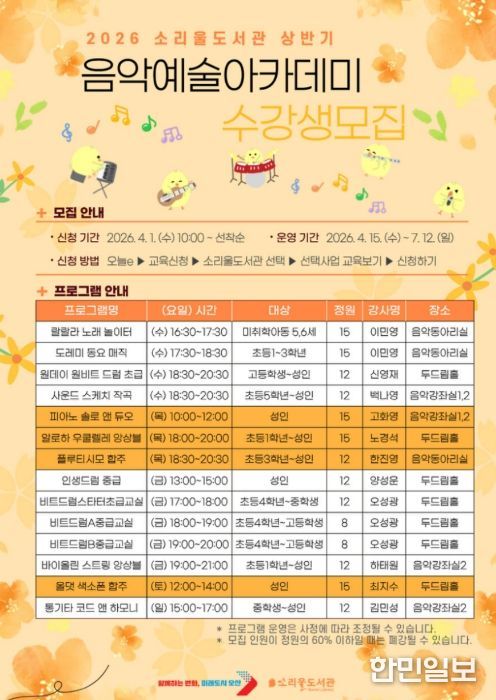 한민일보 서울포커스 임경복 기자 | 오산시 소리울도서관은 시민들의 예술적 감수성을 높이고 일상 속 음악 문화를 확산하기 위해 ‘2026년 소리울도서관 상반기 음악예술아카데미’ 수강생을 모집한다고 밝혔다.