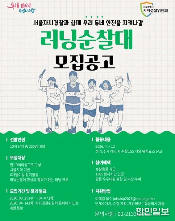 한민일보 서울포커스 국용호 기자 | 서울시 자치경찰위원회는 러닝을 하며 동네 안전까지 함께 살피는 시민 참여형 활동인 서울 러닝 순찰대에 참여할 2026년 신규 대원을 모집한다. 올해는 10개 단체(크루) 200명 규모로 확대해 운영할 계획이다.