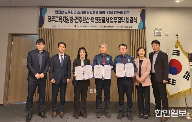 전주교육지원청은 31일 전주꽃심호텔 세미나실에서 전주완산경찰서, 전주덕진경찰서와 학교폭력 예방과 학생안전·보호 강화를 위한 업무협약을 체결했다.