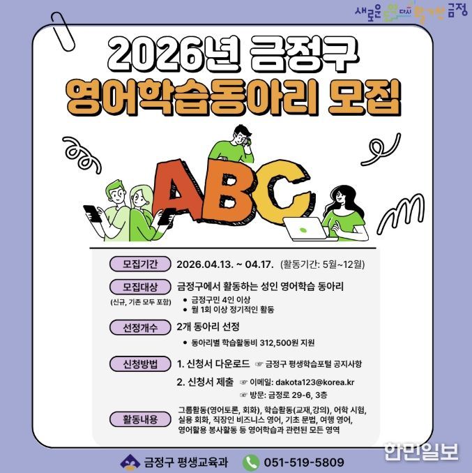 한민일보 서울포커스 임광현 기자 | 부산 금정구는 구민의 자율적인 영어 학습활동을 장려하고 학습공동체 문화를 확산하기 위해 오는 4월 13일부터 17일까지 ‘2026년 영어학습동아리 지원사업’ 참여 동아리를 모집한다고 밝혔다.