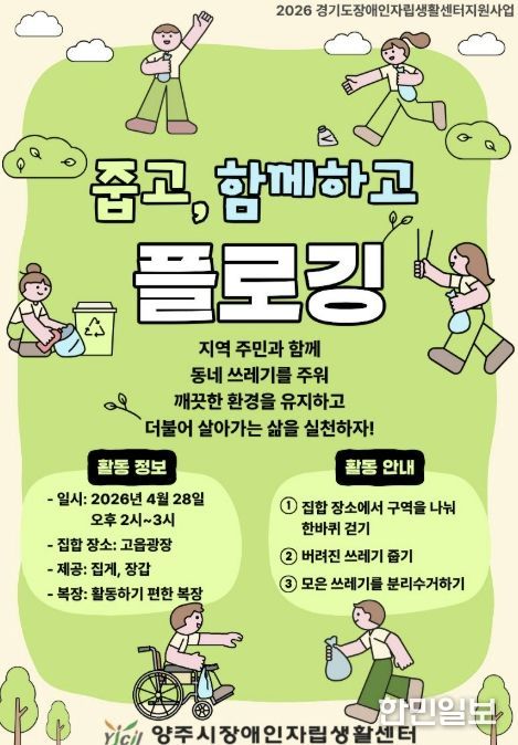 한민일보 서울포커스 임경복 기자 | 양주시장애인자립생활센터에서는 권익옹호 사업의 일환으로 플로깅[줍고, 함께하고] 참가자를 모집한다.