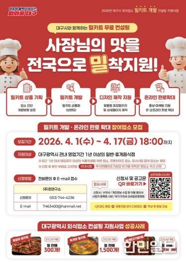 한민일보 서울포커스 임철현 기자 | 대구광역시는 지역 외식업소의 경쟁력을 높이고 온라인 시장 진출을 돕기 위한 ‘2026년 외식업소 밀키트 개발 컨설팅 지원사업’ 참여업소를 오는 4월 17일까지 모집한다.