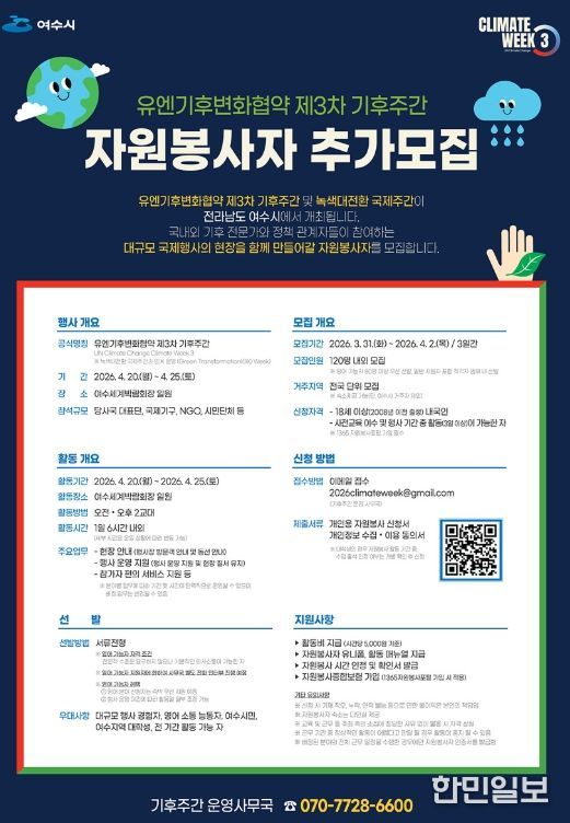 한민일보 서울포커스 임광현 기자 | 여수시는 오는 4월 개최되는 ‘유엔기후변화협약 제3차 기후주간(UN Climate Change Week 3)’과 ‘녹색대전환(GX) 국제주간’의 원활한 운영을 위해 자원봉사자를 추가 모집한다고 밝혔다.