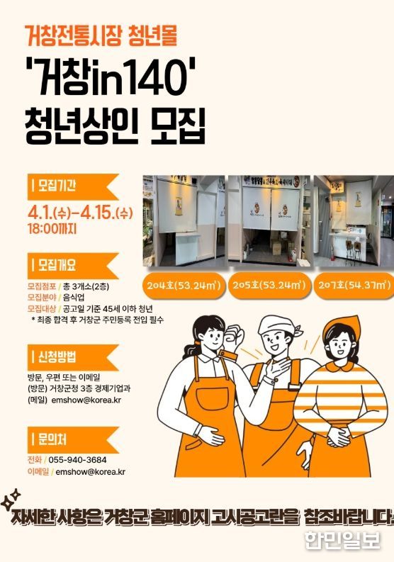한민일보 서울포커스 김서윤 기자 | 거창군은 오는 4월 1일부터 15일까지 전통시장에 활력을 불어넣고 청년 창업 기반 조성을 위해 거창전통시장 내 청년몰 ‘거창in140’에 입점할 청년 창업인 3명을 추가 모집한다.