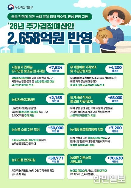 한민일보 서울포커스 임철현 기자 | 농림축산식품부는 2026년 추가경정예산안으로 총 2,658억원을 편성했다고 밝혔다.
