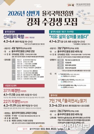 율곡국학진흥원 관계자는 “2026년 상반기 인문 프로그램은 전통과 현대, 교육과 실천을 아우르며 시민들과 지역사회의 인문적 소양을 높이기 위해 준비했다.”라며, “많은 시민이 이번 프로그램에 참여해 인문학이 주는 깊이와 전통문화의 가치를 함께 체감하길 바란다.”라고 밝혔다.