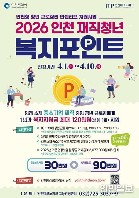 한민일보 서울포커스 유창렬 기자 | 인천광역시는 중소기업 재직 청년들의 근로 의욕을 높이기 위해 ‘인천 재직청년 복지포인트 지원사업’의 참여자를 4월 1일부터 4월 10일까지 모집한다고 밝혔다.