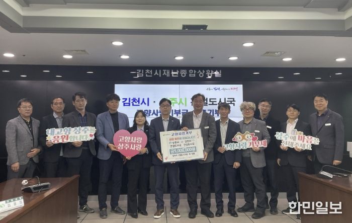 한민일보 서울포커스 김봉순 기자 | 상주시 건설도시국에서는 3월 31일 김천시청에서 김천시 건설도시국을 비롯한 부서 관계자들이 참석한 가운데‘고향사랑 기부제’상호기부 협약식을 가졌다.