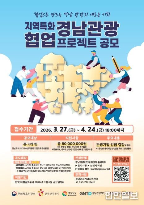 한민일보 서울포커스 임경복 기자 | 경상남도는 경남관광재단 관광기업지원센터 주관으로 도내 관광기업 간 협업을 통해 지역 현안을 해결하고 경남만의 특화 관광콘텐츠를 발굴·실증하는 ‘2026 지역특화 경남관광 협업 프로젝트’ 참여기업을 4월 24일까지 모집한다고 밝혔다.