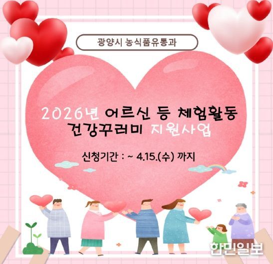 한민일보 서울포커스 임광현 기자 | 광양시가 어르신·장애인·아동 등 실외 활동이 어려운 이용자를 대상으로 ‘체험활동 건강꾸러미 지원사업’을 추진하고, 4월 15일까지 신청을 받는다.