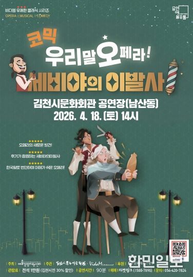 한민일보 서울포커스 임경복 기자 | 김천시 문화예술회관은 온 가족이 함께 웃으며 즐길 수 있는 우리말 코믹 오페라 '세비야의 이발사'를 오는 4월 18일, 김천시문화회관(남산동)에서 개최한다.