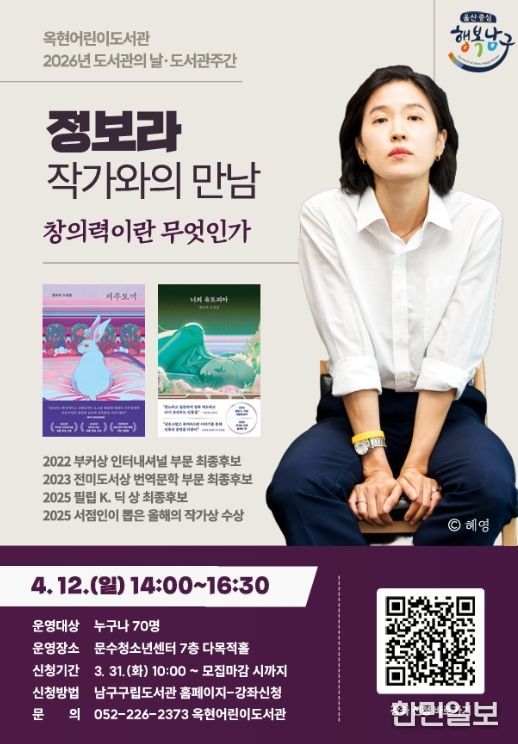 한민일보 서울포커스 기자 | 남구 옥현어린이도서관은 도서관의 날과 도서관주간을 맞아 주민들이 문학을 통한 창의력 증진과 예술적 사고를 확장하는 기회를 제공하고자 ‘정보라 작가와의 만남’행사를 기획해 수강생 모집에 나섰다.
