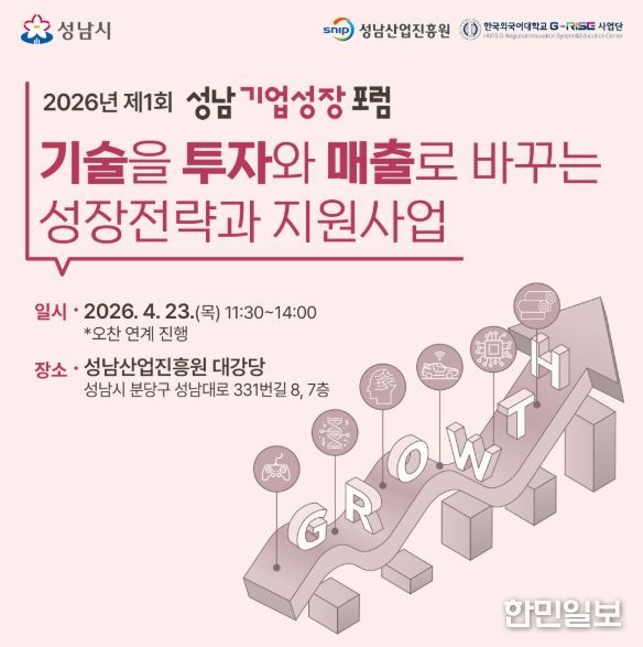 한민일보 서울포커스 임철현 기자 | 성남산업진흥원은 4월 23일 11시 30분부터 성남산업진흥원 대강당에서 '2026년 제1회 성남기업성장포럼'을 개최한다. 이번 행사는 기술 기반 투자유치와 중동사태 대응 방안을 중심으로 성남 기업의 매출 성장과 글로벌 진출을 모색한다.