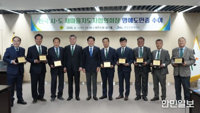 제주도는 1일 오전 도청 삼다홀에서 전국 시도 새마을지도자협의회장 명예도민증 수여식을 열었다. 행사에는 양윤호 새마을지도자중앙협의회장을 비롯해 전국 각 시도를 대표하는 협의회장 등 20명이 참석했다.