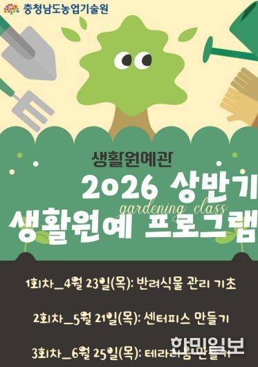 한민일보 서울포커스 박덕환 기자 | 충남도 농업기술원은 도민의 생활 속 식물문화 확산을 위해 ‘2026년 상반기 생활원예 프로그램’ 일반인 과정 참여자를 모집한다고 2일 밝혔다.