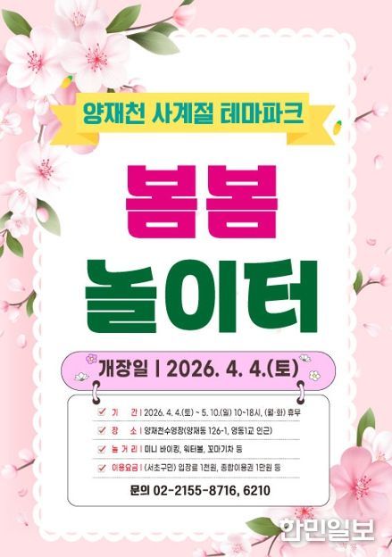 한민일보 서울포커스 곽중희 기자 | 서울 서초구(는 지난 겨울 큰 사랑을 받았던 양재천 눈썰매장을 4월 4일(토)부터 어린이 테마파크인 ‘봄봄놀이터’로 운영한다고 밝혔다.