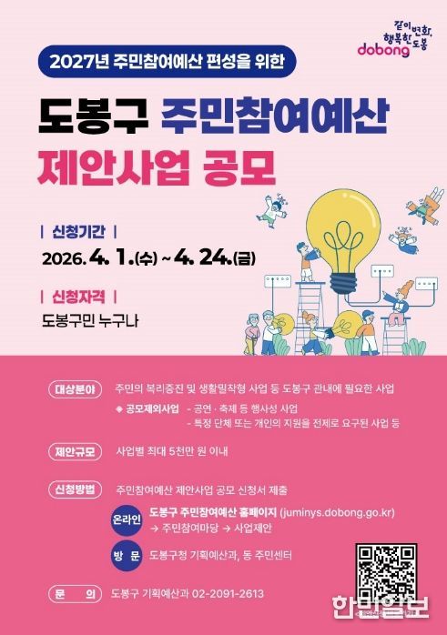 한민일보 서울포커스 김봉순 기자 | 서울 도봉구가 2027년 예산편성을 위한 주민참여예산 제안사업을 공모한다.
