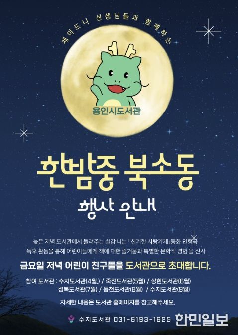 한민일보 서울포커스 김성윤 기자 | 용인특례시 서부도서관은 수지‧죽전‧상현‧성복‧동천도서관에서 야간 독서문화 프로그램 ‘한밤중 북소동’을 운영한다고 25일 밝혔다.