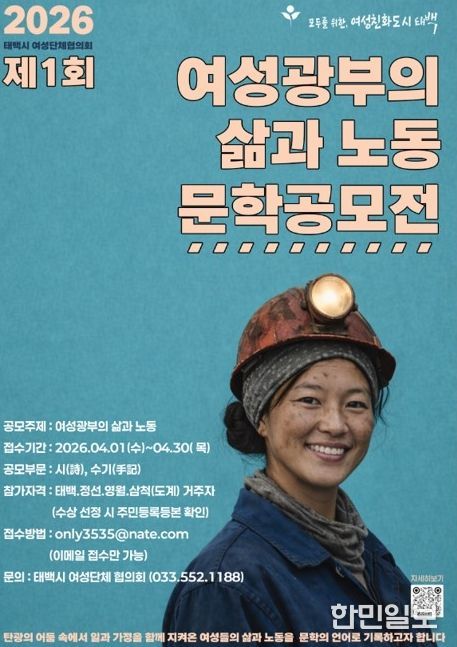 한민일보 서울포커스 임경복 기자 | 태백시 여성단체협의회(회장 김미숙)는 오는 4월 1일부터 30일까지 '2026년 여성광부의 삶과 노동' 문학 공모전을 개최한다고 밝혔다.