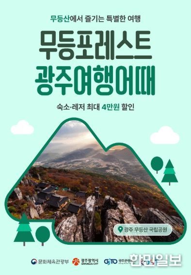 온라인 여행 플랫폼 ‘여기어때’에서 숙박 최대 3만원, 레저 이용권 최대 1만원 등 1인당 최대 4만원까지 추가 할인을 받을 수 있다. ‘무등포레스트’는 문체부와 광주시가 함께 자연과 도심을 함께 즐길 수 있는 광주지역 관광자원을 활용해 방문객 체류 시간을 늘리기 위해 추진하고 있다.