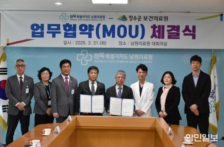 한민일보 서울포커스 김용택 기자 | 장수군 보건의료원은 지난 31일 남원의료원과 의료취약지역 응급환자의 신속하고 안전한 직접 이송·치료 연계 및 장수지역 공공보건의료 협력 강화를 위한 업무협약을 체결했다고 밝혔다.