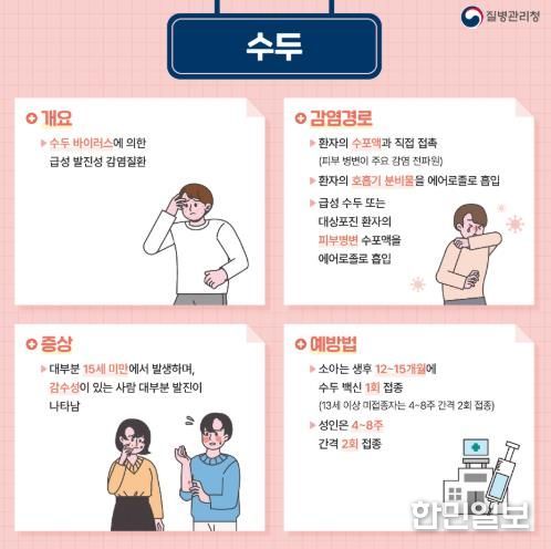 수두와 유행성이하선염은 환자가 기침할 때 나오는 침방울 등 호흡기 분비물을 통해 전파되는 대표적인 감염병이다.
