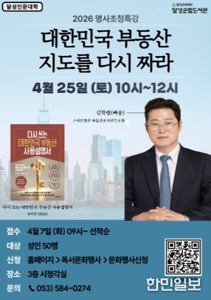 한민일보 서울포커스 임경복 기자 | 대구 달성군립도서관이 대한민국 대표 부동산 전문가 ‘빠숑’ 김학렬 스마트튜브 부동산조사연구소장을 초청해 특별 인문학 강연을 연다. 수강 신청은 오는 7일부터 달성군립도서관 누리집을 통해 선착순으로 진행된다.