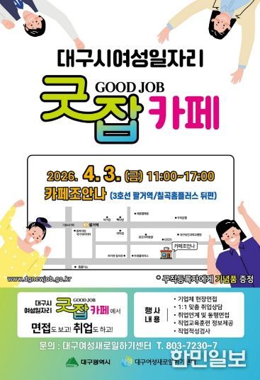 한민일보 서울포커스 임경복 기자 | 대구광역시는 취업을 희망하는 경력단절 및 미취업 여성을 위해 4월 3일 오전 11시부터 북구 소재 ‘카페 조안나(칠곡점)’에서 올해 첫 ‘찾아가는 여성일자리 굿잡(Good Job)카페’를 개최한다.