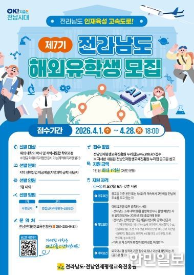 한민일보 서울포커스 박정민 기자 | 전라남도와 전남인재평생교육진흥원은 글로벌 핵심 인재 육성을 위해 세계 명문대 유학 기회를 제공하는 ‘제7기 전라남도 해외유학생’을 오는 28일까지 모집한다고 밝혔다.