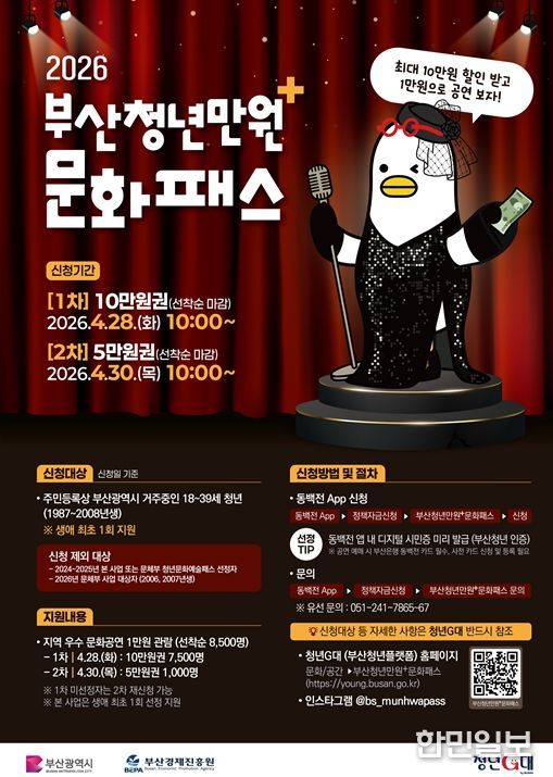 다만, ‘2026년 청년문화예술패스’ 대상자(2006~2007년생)와 2024년~2025년 사업 수혜자(부산청년만원+문화패스, 청년문화예술패스)는 중복 지원 방지를 위해 이번 신청에서 제외된다.