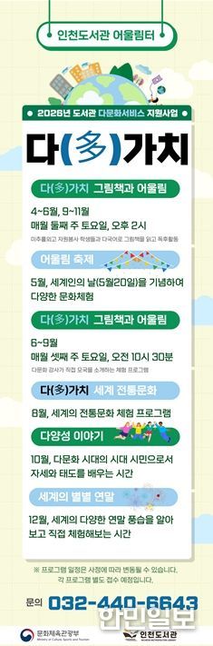 한민일보 서울포커스 유창렬 기자 | 인천광역시 인천도서관은 어린이를 대상으로 다양한 문화를 이해하고 존중하는 태도를 기를 수 있도록 2026년 도서관 다문화서비스 지원사업 '다(多)가치'를 운영한다고 밝혔다.
