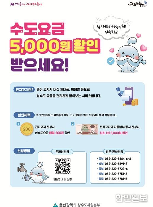 한민일보 서울포커스 임경복 기자 | 울산시 상수도사업본부는 시민들의 요금 납부 편의 증진과 종이고지서 사용 감축을 통한 친환경 행정 실현을 위해 오는 5월부터 상수도요금 전자고지 및 자동납부 신청자에게 요금 할인 혜택을 제공한다고 밝혔다.