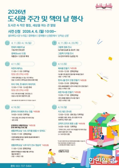한민일보 서울포커스 임경복 기자 | 원주시 샘마루도서관은 ‘도서관 주간 및 책의 날’을 기념해 4월 11일부터 23일까지 작가 강연, 공연, 체험, 전시 등으로 구성된 다양한 문화 행사를 개최한다.