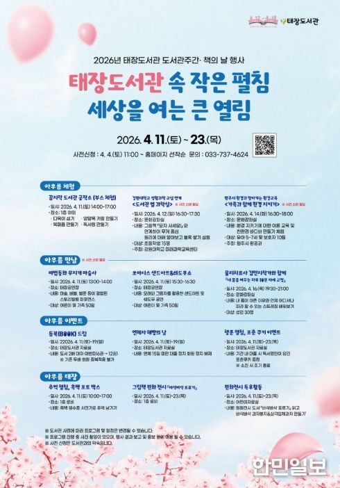 한민일보 서울포커스 임경복 기자 | 원주시 태장도서관은 도서관 주간 및 책의 날을 맞이해 오는 11일부터 23일까지 ‘태장도서관 속 작은 펼침, 세상을 여는 큰 열림’을 주제로 다양한 행사를 개최한다.