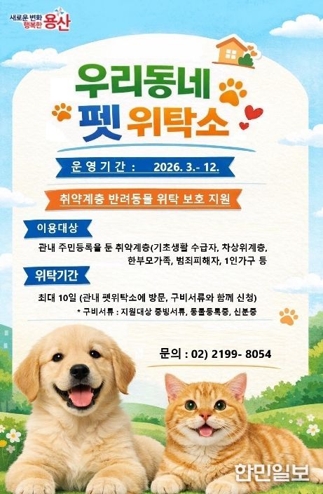 한민일보 서울포커스 김서윤 기자 | 서울 용산구가 경제적 어려움이나 입원 등으로 장기간 집을 비워야 하는 상황에서 반려동물을 돌보지 못하는 취약계층의 부담을 덜기 위해 ‘2026 우리동네 펫 위탁소’ 사업을 추진한다.