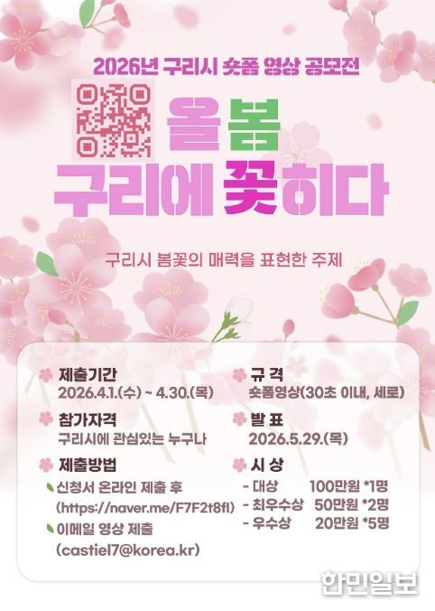 한민일보 서울포커스 김정옥 기자 | 구리시는 올해 새롭게 시작하는 봄꽃 축제 ‘장자호수 벚꽃마실 축제’를 효과적으로 홍보하고 시민과의 소통을 강화하기 위해 ‘2026 구리시 숏폼 영상 공모전 '올봄, 구리에 꽃히다'’ 접수를 4월 30일까지 진행한다고 밝혔다.