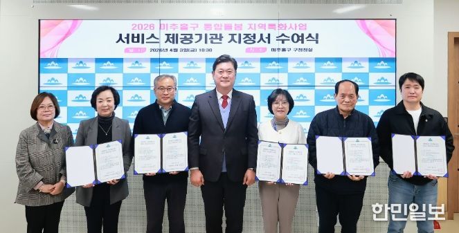 한민일보 서울포커스 백진욱 기자 | 인천 미추홀구는 3일 구청장실에서 ‘2026년 미추홀구 통합 돌봄 지역특화 사업을 수행할 서비스 제공기관 5곳에 지정서를 수여했다고 밝혔다.