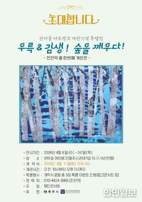 한민일보 서울포커스 김다남 기자 | 충주시는 구 조선식산은행 건물을 복합문화공간 ‘관아골 아트뱅크’로 새롭게 단장하고 첫 특별전으로 전찬덕 작가의 ‘우륵&김생! 숲을 깨우다’를 4월 8일부터 30일까지 개최한다고 3일 밝혔다.