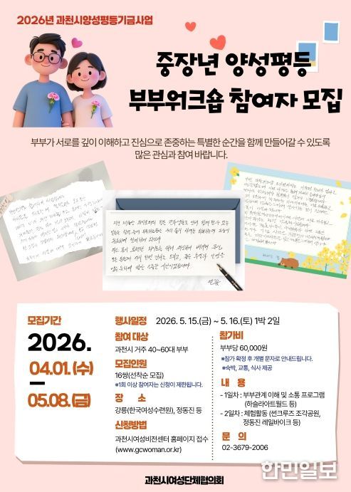 한민일보 서울포커스 최성훈 기자 | 과천시는 중장년 부부의 건강한 관계 형성과 양성평등한 가족문화 확산을 위해 ‘중장년 양성평등 부부워크숍’을 추진하며, 참여자를 모집 중이라고 3일 밝혔다.
