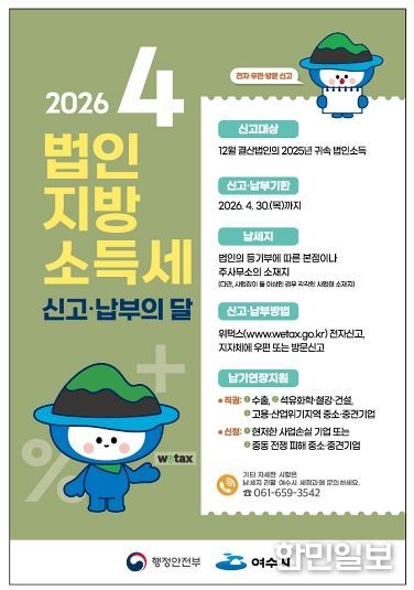한민일보 서울포커스 임광현 기자 | 여수시는 4월 한 달간 ‘2025년 귀속 법인지방소득세에 대한 집중 신고·납부 기간’을 운영한다고 밝혔다.