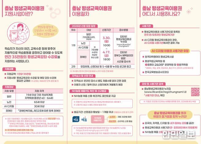 한편, 신청 및 카드발급 등 관련 문의는 충남 평생교육이용권 상담콜센터 또는 누리집 게시판을 통해 확인할 수 있다.