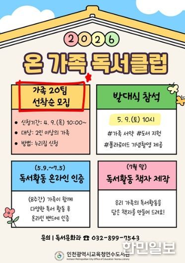 한민일보 서울포커스 유창렬 기자 | 인천광역시교육청연수도서관은 5월 9일부터 가족이 함께 책을 매개로 소통하며 성장하는 ‘온 가족 독서클럽’을 운영한다.