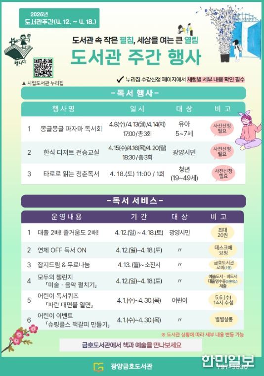 한민일보 서울포커스 임광현 기자 | 광양금호도서관이 4월 도서관주간을 맞아 시민이 책과 예술을 함께 즐길 수 있도록 다양한 특별 프로그램을 운영한다.