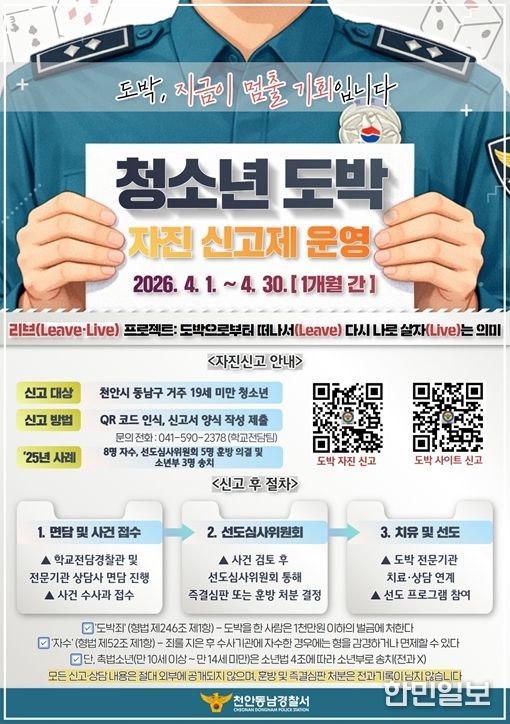 한민일보 서울포커스 황준형 기자 | 천안동남경찰서는 청소년 도박 문제의 선제적 예방과 조기 개입을 위해 2026년 4월 1일부터 4월 30일까지 한 달간 ‘청소년 도박 자진 신고제’를 운영한다고 밝혔다.